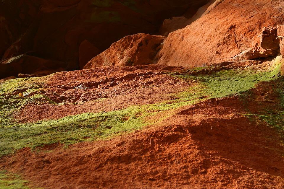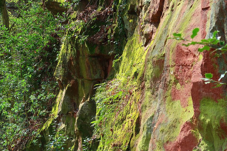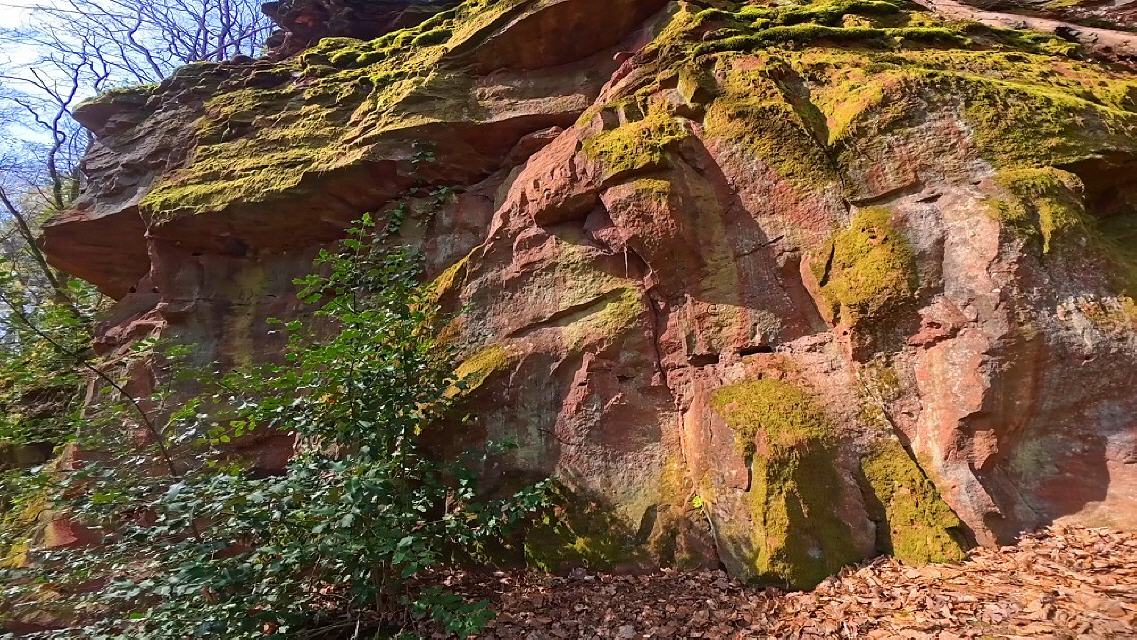 Der Pfad entlang der Steinbrüche stößt auf einen breiten Fußweg, dem man nach links durch steileres Gelände folgt. Sandsteinfelsen stehen am Weg an. Nach rund 250 m des enthalten sie größere gelbe Partien. Mit etwas Glück findet man hellgelbe verkieselte Sandsteine mit dünnen Schwerspatbelägen. 550 m weiter öffnet sich auf der linken Seite eine große und bis zum Kamm reichende Geländemulde. Felsnasen stehen hervor, ansonsten überwiegt Gesteinsschutt. So sieht ein gut 800 Jahre alter Steinbruch aus, der feuchten Klimabedingungen mit starkem Baumbewuchs ausgesetzt ist. Auffällig ist der nun gelbliche Sandstein. Dabei dürfte es sich um den wichtigsten Burgsteinbruch handeln, denn die Burg besteht ganz überwiegend aus gelblichem Sandsteinmauerwerk.