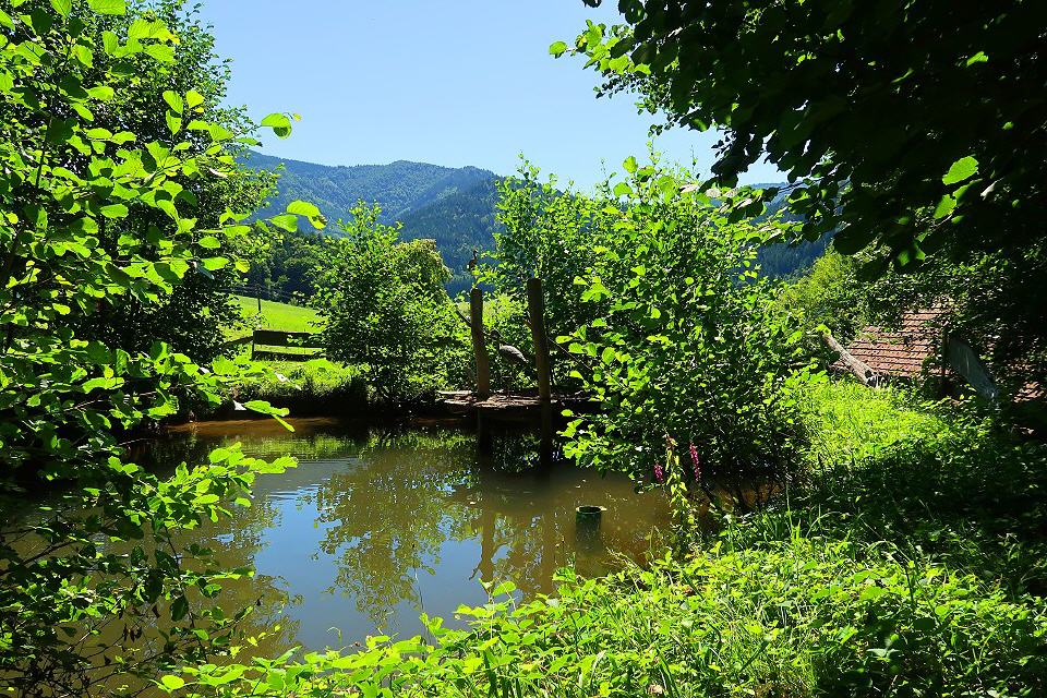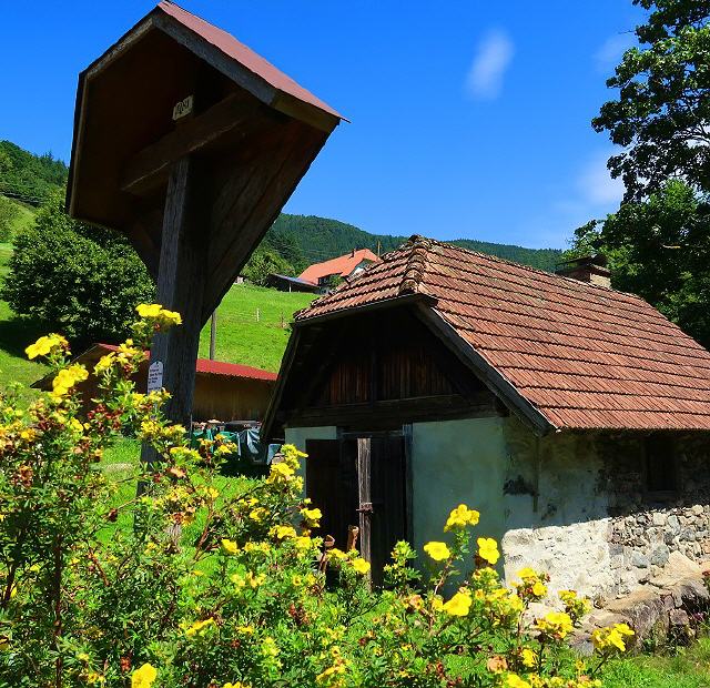 Von hier aus wechseln Sie die Straßenseite und gehen nach etwa 30 m rechts über die Brücke (Schild Stabhalterhof). Vor dem Hof gehen Sie rechts auf dem schmalen Pfad, der zur Wassertretstelle, zum Sportplatz und Schwimmbad führt. Entlang des Baches kommen Sie zur Kirchstraße, auf der Sie nach links gehen und nach rund 150 m den Paradiesweg erreichen, der ins Haslachtal führt. Beim Gasthaus Ratsstüble spazieren Sie durch das schöne Haslachtal und kommen an der Mühle des Vitztinerhofes vorbei. Bei der Einmündung in die Haslachstraße gehen sie links talaufwärts, vorbei an der Werkst#ttte Kaltenbach und erreichen nach eetwa 500 m die Schwanenmühle, die links unterhalb des Weges liegt.