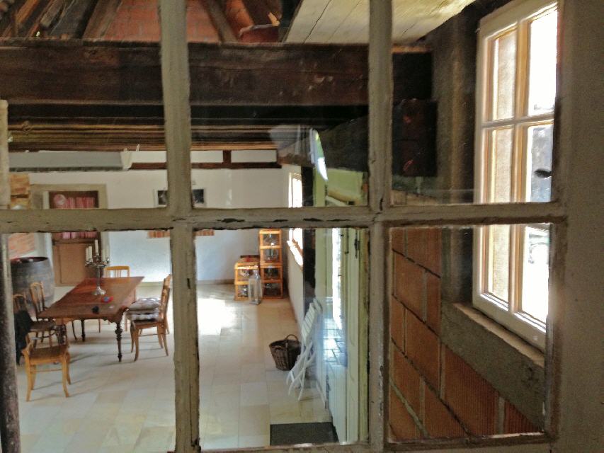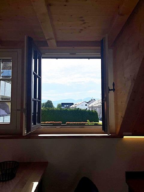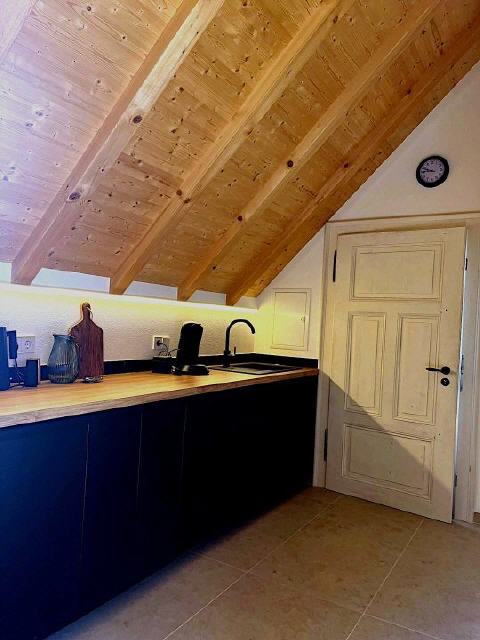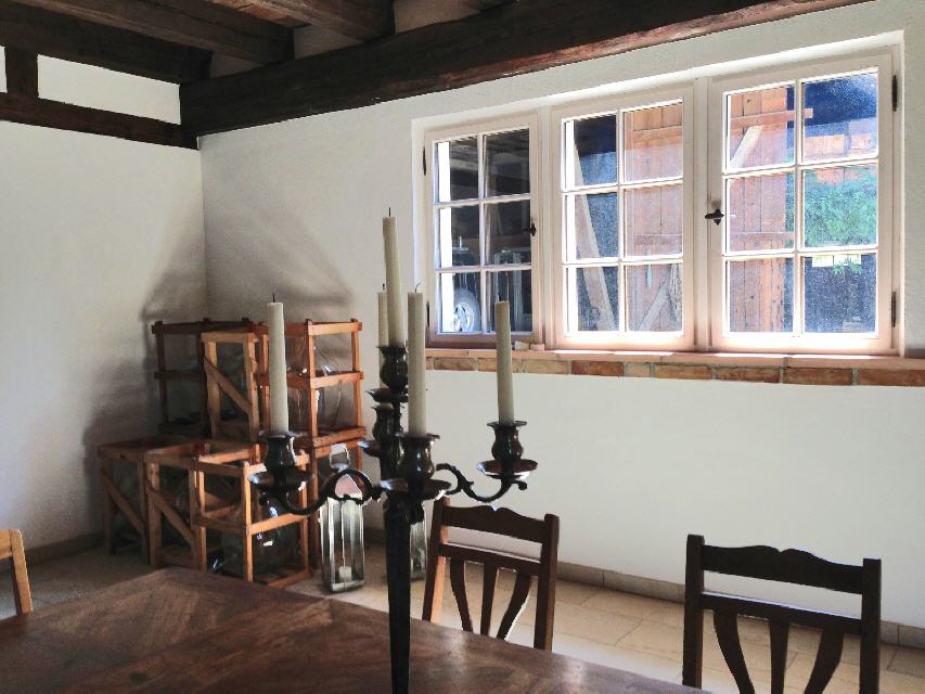 Zwei gemütliche Sessel mit Teetisch laden zum Entspannen ein. Ein Echtholz Hochtisch mit zwei drehbaren Hochstühlen eignen sich für Frühstück und Brotzeiten in privater Atmosphäre.