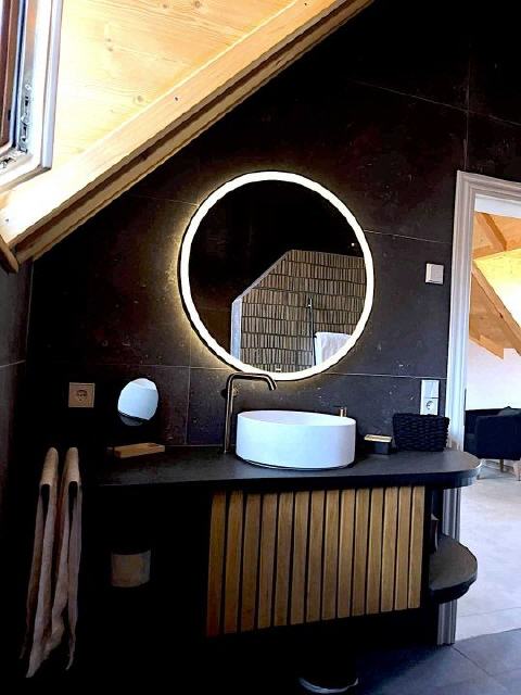 Ein absolutes Highlight ist das Design Bad: Die bodentiefe Regendusche mit Ambientelicht auf Bewegung sowie das hochwertige Aufsatzwaschbecken mit Echtsteinplatte und beleuchtetem Spiegel.