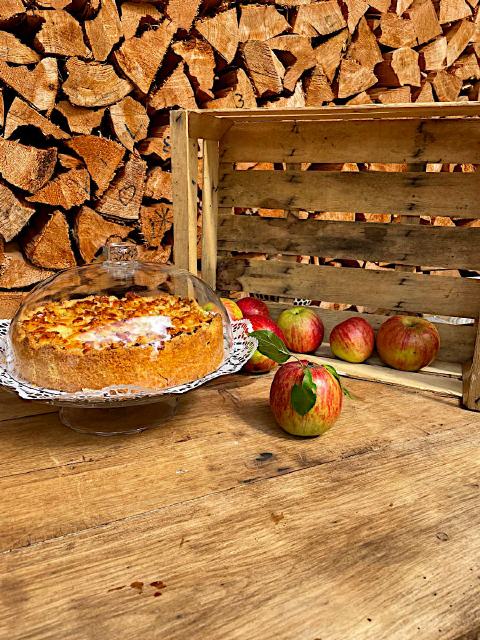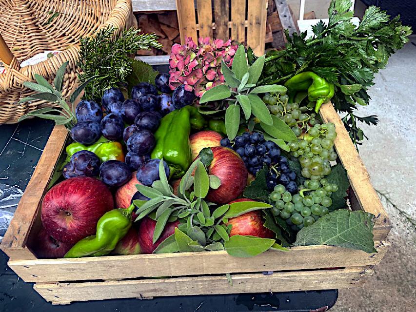 Außenbereich: Großer Obstgarten mit Rückzugsorten und Essbereich im Freien.