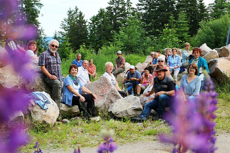 7. Wildsaustein. 300 Meter westlich vom Eulenstein ist der Holzeck erreicht. Der Asphaltstraße folgend stoßen wir zu einem der schönsten Aussichtspunkte um Schonach. In dieser aussichtsreichen Lage steht der Wildsaustein. Der Stein gleicht seinem namensgebenden Tier. Auf der Oberseite ist eine 65 cm große Schale mit breitem östlichen Auslauf zu finden. Dieser Stein dient auch als Grenzstein. In unmittelbarer Nähe am Waldrand lädt eine Sitzbank zum Rasten ein und bietet einen schönen Ausblick auf die Schwarzwaldlandschaft.