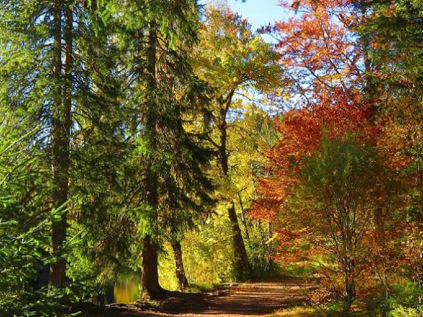 Wir folgen dem Pfad und biegen im Stuckwald links ab, hinunter zum geheimnisvollen Mathisleweiher, dessen Ufer teilweise unter Naturschutz stehen und genießen diese Idylle. Wir schlendern linksseitig am See entlang und halten uns in Richtung Oberzarten / Dreiwege. Am Mathislehof mit eigenem Bauernhofladen vorbei biegen wir rechts ab zur Dorneck / Helmelwald.