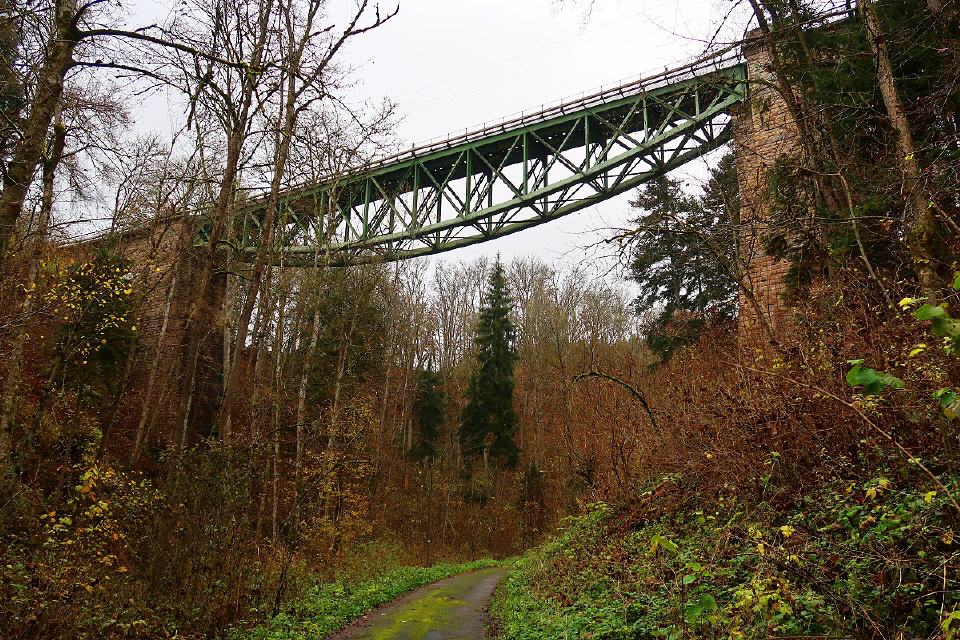 Nach der Unterführung rechts halten. Es kommt ein Fahrweg, dort links einbiegen und weiter rechts neben dem Bach. Nach einem Kilometer wird die Fahrbrücke der Untermauchen erreicht. Diese Brücke nicht überqueren, sondern weiter rechts dem Bach entlang. Ein Schild „frühere Ortschaft Mauchen“ erinnert an das vor etwa 500 Jahre aufgegebene Dorf Mauchen.