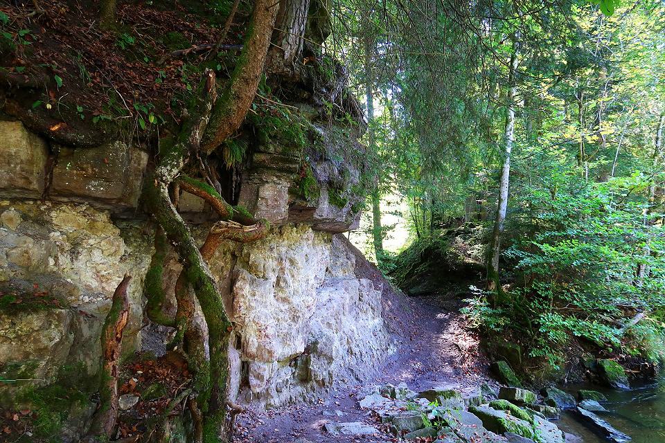 Wer heute entlang des Wutachwanderweges bei Dietfurt auf Spurensuche geht, kommt unweigerlich am Dietfurter Wasserfall vorbei. Er liegt an der Schelmenhalde und ist ein ganz besonderer Wasserfall. Über stark bemooste Felsen ergießt sich ein Bach, dessen Wasser wie ein Vorhang herabrieselt. Man bezeichnet dieses Phänomen als Schleierwasserfall.