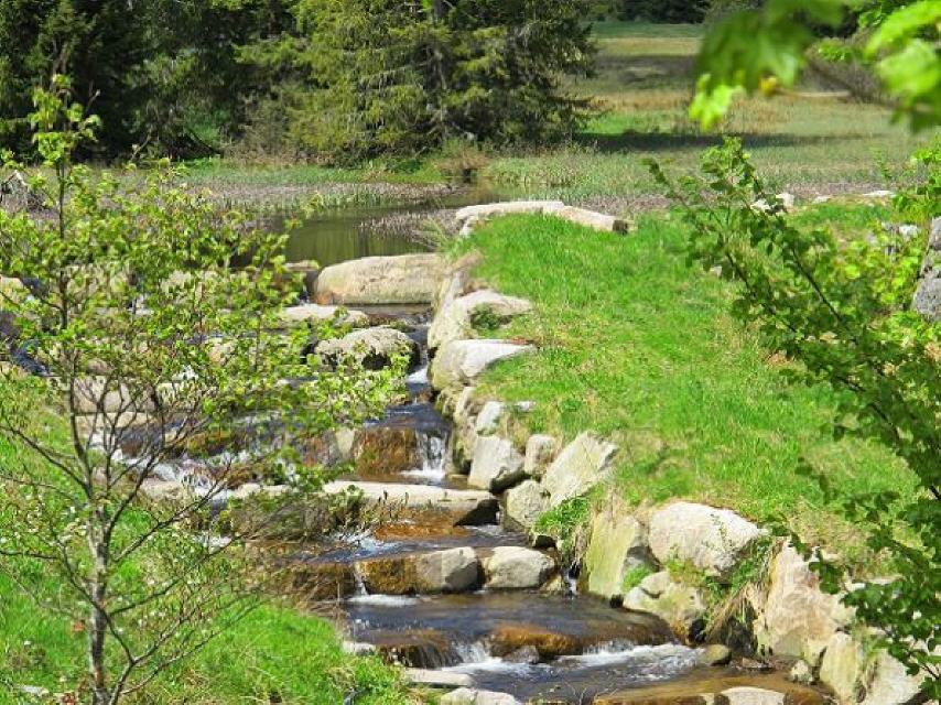 Nach dem Wasserfall haben wir die Möglichkeit zur Einkehr im Café & Berg Beizle „Zum Kuckuck“. Anschließend folgen wir dem Asphaltweg ein kurzes Stück bergan bis zur Übersichtstafel. Von dort geht es auf einem Menzo-Weg über den Weidberg, den Kohlbrunnen bis zu einem besonders schönen Erlen-Wäldchen und den beiden Radon- und Fluorit-Quellen. Über eine Krunkelbach-Brücke kommen wir zum Brandweg, überqueren diesen und folgen dem Pfad oberhalb der Lesestein-Mauer über die Krunkelbach-Weiden Richtung Osten.