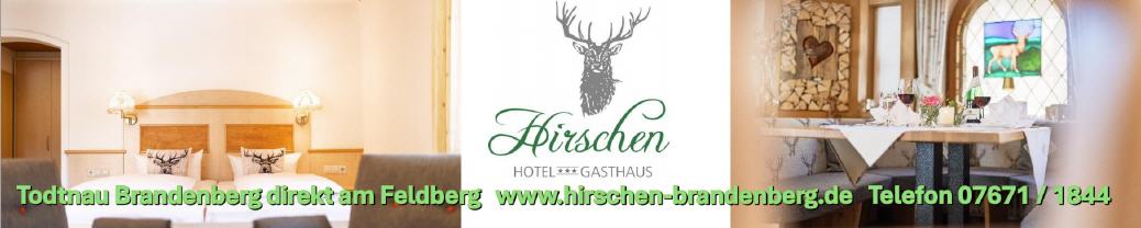 Im Hotel Gasthaus Hirschen in Brandenberg zwischen Todtnau und dem Feldberg werden Sie sich wohlfühlen. Lassen Sie sich verwöhnen in zeitgemäßem Komfort, der Wärme und Geborgenheit ausstrahlt. Alle Zimmer sind ausgestattet mit Dusche / WC, Föhn, Safe, Sat - TV, Radio, Telefon, W-LAN und teilweise Balkon. In unserer gemütlichen Gaststube / Restaurant verwöhnen wir Sie mit badischen Spezialitäten. Der Chef kocht persönlich. Preis ab 51 Euro. Bild antippen!
