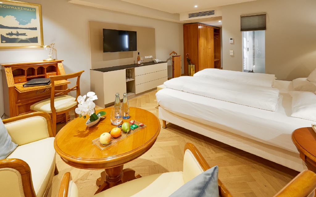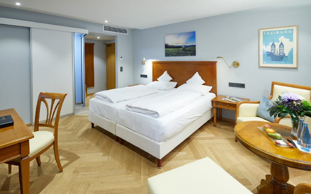 Suite Dreisamtal. Exklusive Suite 55 qm, Balkon 6 qm, Südwestseite zum Garten. Die Dreisam-Tal-Suiten versprichen ein exklusives Wohnerlebnis mit heimischem Flair: Die großzügig geschnittenen Suiten mit modernem Badezimmer bieten neben vielen Verwöhn-Extras auch einen besonderen Komfort durch die Möglichkeit, das Wohnzimmer auf Wunsch als zweites Schlafzimmer mit Einzelbett zu nutzen. Ideal für getrennt schlafende Paare oder auch für 3 Personen. Sorgfältig ausgewählte Details betonen die gehobene Extraklasse.