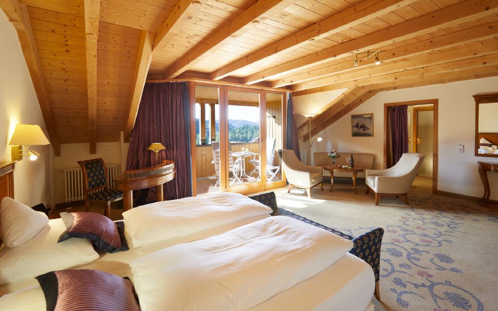 Doppelzimmer Münstertal. Doppelzimmer 42 qm, Balkon 8 qm, Waldseite mit Morgensonne. Der dezent-exquisite Einrichtungsstil gibt auch hier den Ton an: Harmonische Leichtigkeit in einer warmen Atmosphäre sorgt für Erholung ab dem ersten Augenblick. Der große Balkon lädt zum Frühstück in der Morgensonne ein und verspricht an heißen Sommertagen angenehme Kühle. Besondere Ausstattungsmerkmale: zum Teil überlange Betten (210 x 180 cm), separate Toilette und begehbare Ankleide.