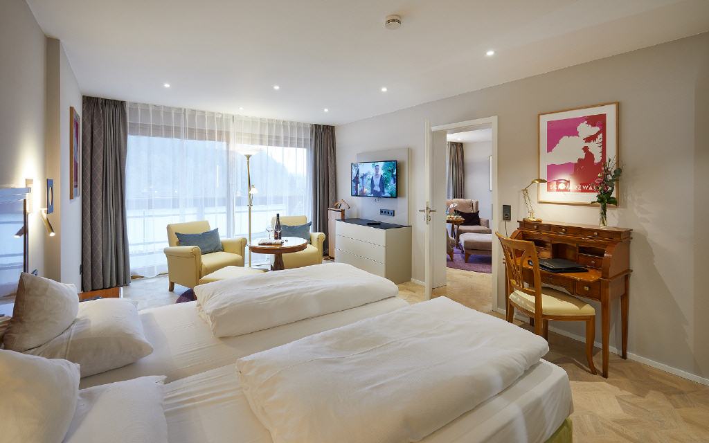 Suite Jostal. Exklusive Suite 55 qm, Balkonm 10 qm, Waldseite mit Morgensonne. Wohlfühlambiente für höchste Ansprüche: In einem feinfühlig abgestimmten Ensemble aus Farben, Materialien und Accessoires strahlt die Jostal-Suite zeitlose Exklusivität aus. Die unverkennbare Design-Handschrift schafft auch hier ein behagliches Wohnerlebnis. Das flexible Komfort-Extra: Wohn- und Schlafzimmer sind durch eine Schiebetüre getrennt und können als separate Schlafzimmer genutzt werden. Ideal für getrennt schlafende Paare oder auch für 3 Personen.