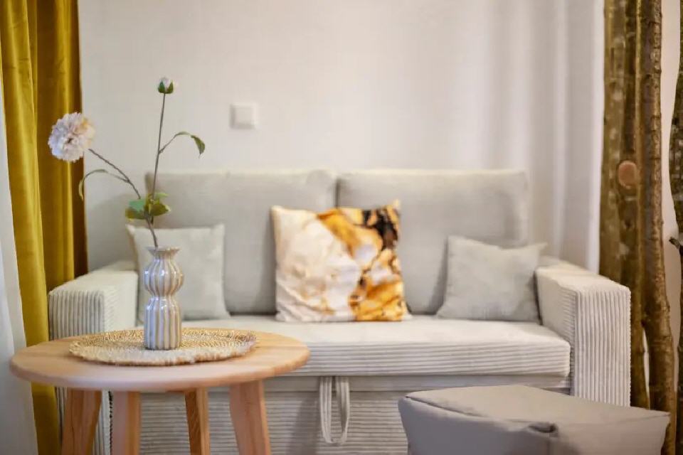B5 - 1-Raum-Studio für 2 Personen mit Balkon: 1 kombinierter Wohn-/Schlafraum mit Flachbild-TV 32”, Sofa, 2 ausklappbare Schrankbetten, Esstisch, 3 Stühle, 1 Infrarotheizung, Küche mit Spülmaschine, Mikrowelle, 4- Plattenherd ohne Backofen, Wasserkocher, Kaffeemaschine, Toaster, Wannenbad mit Bidet und Fön, Balkon. In dieser Wohnung sind Hunde leider nicht gestattet.