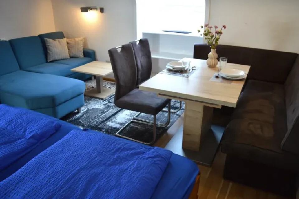 A2 - 2-Raum-Apartment für bis zu 6 Personen: 1 Wohnzimmer mit SmartTV Funktion, Schlafsofa für 2 Personen, Hängesessel, 1 Schlafzimmer mit Doppelbett (180cm), 1 Etagenbett, Schreibtisch, 1 Kleiderschrank, große Küche mit Backofen und Spülmaschine, Herd, großer Kühlschrank, Kaffeemaschine, Toaster, Wasserkocher, großer Esstisch mit 8 Stühlen, Bad mit Badewanne, Fön und Handtüchern, Terasse mit direktem Gartenzugang. Es sind max. ein großer Hund oder zwei kleine Hunde erlaubt. Hunde dürfen keinesfalls auf Sofa oder Bett!