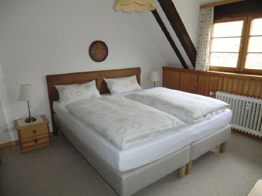 Die Wohnung verfügt über ein Schlafzimmer mit Doppelbett (B 1.80 m x L 2.00 m, getrennte Matratzen). Die Betten sind bezogen.