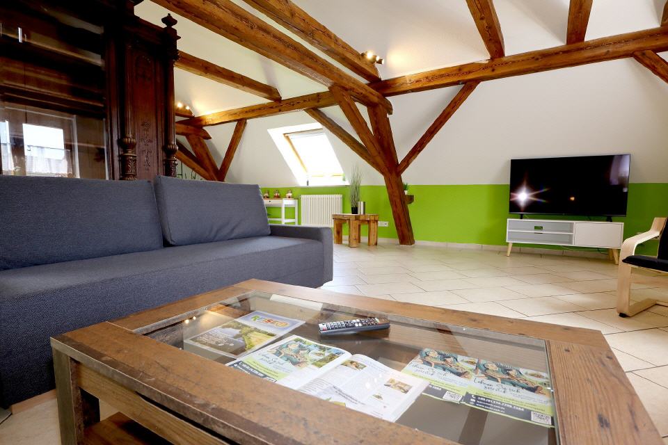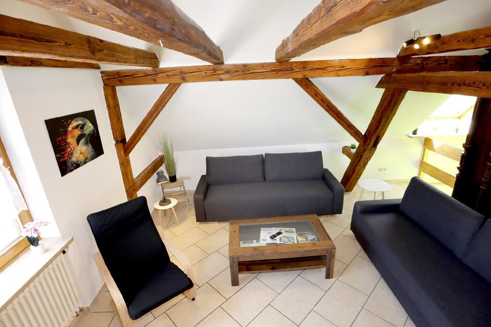 Willkommen im Falkenburg Loft – Ihr Rückzugsort im Ortenaukreis! Die Ferienwohnung Falkenburg befindet sich in einem über 300 Jahre alten, liebevoll und biologisch restaurierten Bauernhaus. Das Falkenburg-Loft vereint historischen Charme mit modernem, nachhaltigem Wohnen, stilvollem Komfort und bietet Ihnen eine besondere Atmosphäre zum Entspannen, Genießen und Erholen. Eingebettet in ein großes Grundstück mit Blick vom Balkon auf die plätschernde Elz, erleben Sie hier die Natur. Das Herzstück der Wohnung ist die offene Galerie – ein großzügiger, lichtdurchfluteter Raum mit Fernseher, gemütlicher Sitzecke und viel Platz zum Lesen, Entspannen oder einfach zum Abschalten. Die besondere Raumhöhe und das offene Design verleihen der Galerie ihren ganz eigenen Charme.
