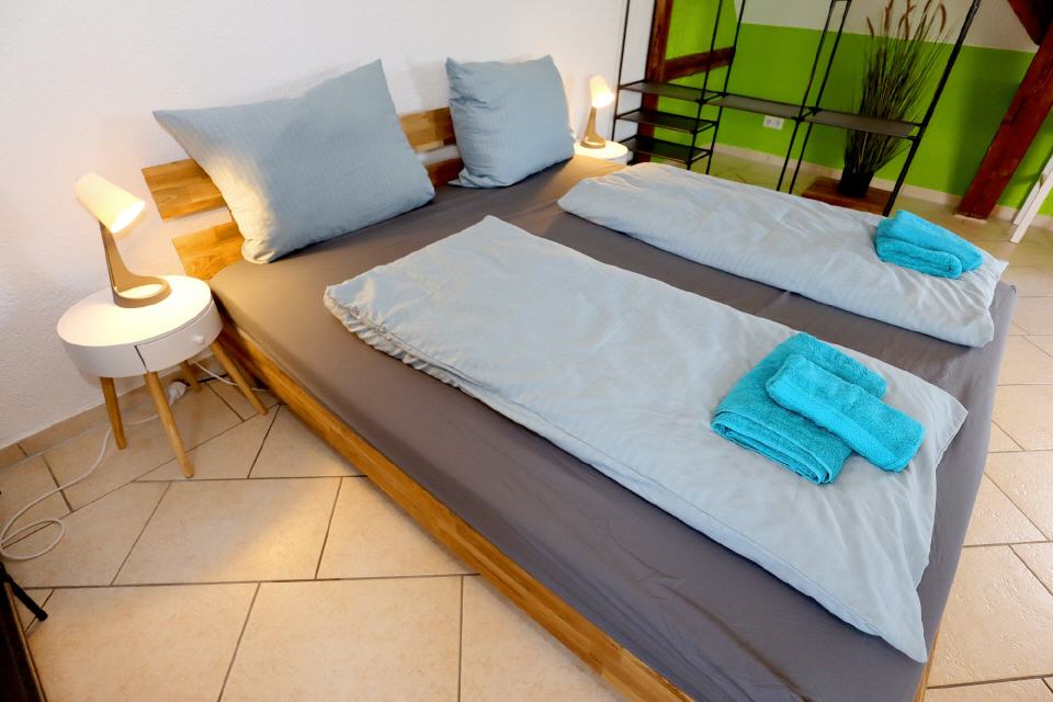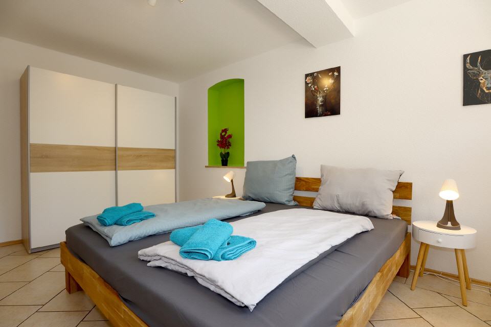 - Schlafbereich: Bettwäsche, Schlafsofa, Doppelbett, Kleiderschrank