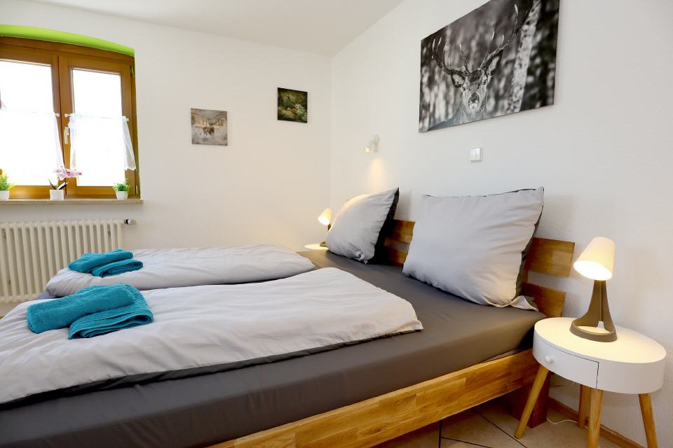 Die Ferienwohnung Falkenburg Loft bietet insgesamt drei Doppelbetten: je eines in zwei separaten Schlafzimmern und ein weiteres in der offenen Galerie. Zusätzlich steht im Wohnzimmer (Galerie) ein Schlafsofa für zwei Personen zur Verfügung – so finden hier bequem bis zu 8 Personen Platz.