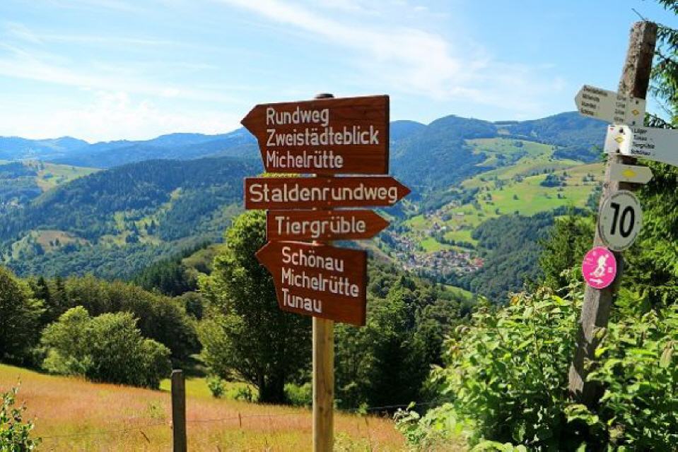 Vom Zweistädteblick beginnt nun der Abstieg auf schmalen Bergweiden und durch Heidelbeerstauden, bis wir schließlich auf breiten Wanderweg nach Michelrütte gelangen. Auf der ganzen Wegstrecke genießen wir nochmals den herrlichen Panoramablick auf die ganze Umgebung. Der größte Findling des Schwarzwaldes – eine Hinterlassenschaft des Wiesegletschers erreichen wir nach wenigen hundert Metern. Danach führt uns gleich nach dem ersten Haus in dem kleinen Weiler der Wanderweg links vorbei Richtung Schönau.