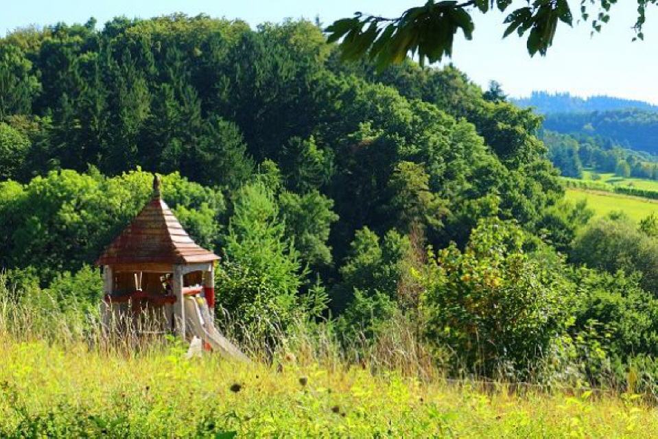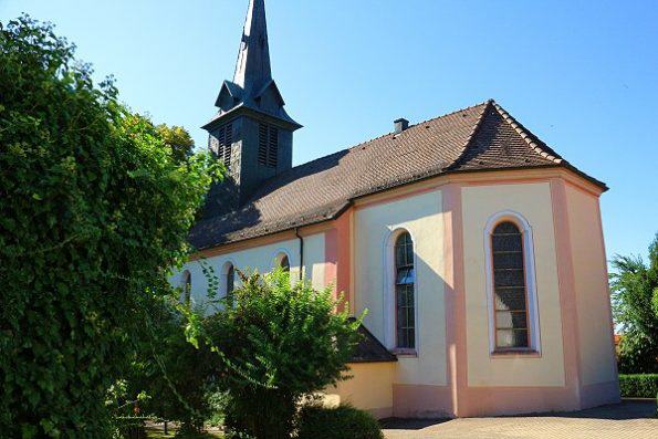 Von hier aus steigt man zur Kirche, dem Wahrzeichen Heuweilers, auf den Berg hinauf und weiter zur Schule und der Kirchberghalle. Zwei Dinge lohnen die kleine Mühe des Aufstiegs: Die einfache, barocke Innenausstattung der Kirche und der herrliche Blick vom Kirchplatz über die Breisgauer Bucht, zum Kaiserstuhl und den Vogesen.