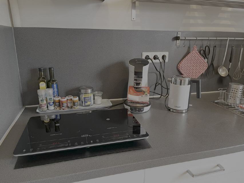 Küche mit gemütlichem Essplatz, 2-Platten-Induktionsherd, Waschmaschine, Kaffeemaschine, Toaster, Mikrowelle (mit Backofen) sowie allem notwendigem Geschirr etc. für bis zu 4 Personen