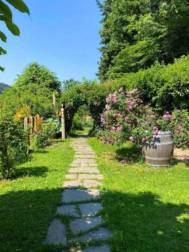 Wenn man dem Winzerpfad entlang den sonnigen Rebbergen des Glottertals folgt, trifft man beim schattenspendenden Waldrand auf die Pension Roseneck. Sie ist umgeben von einer blühenden Oase. Ein Ort zum Ankommen, Dasein und entspannt Verweilen. Mitten im Dorf und dennoch so geschützt.