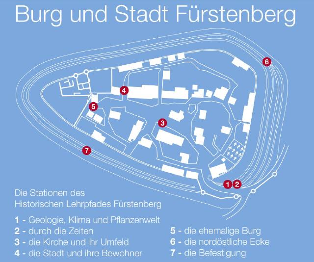 Der „Historische Pfad Fürstenberg“ informiert mit sieben Tafeln über Geologie, Klima und Pflanzenwelt sowie die Geschichte des Berges und seiner ehemaligen Stadt (Führungen auf Anfrage bei der Stadtverwaltung Hüfingen möglich).
