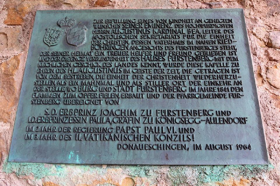 Der Fürstenberg (918 m) ist ein Zeugenberg (Vorberg) der Schwäbischen Alb. Auch der benachbarte Höhenzug Länge (921 m) ist ein solcher Zeugenberg auf der Baar zwischen Schwäbischer Alb und Schwarzwald sowie dem Randen und Schweizer Jura. Nach ihrem „fürdersten" (vordersten) Berg nennen sich ab 1250 die Grafen und späteren Fürsten zu Fürstenberg. Als ihre Stadt auf dem Gipfelplateau 1841 durch ein Feuer zerstört wurde, entstand am Fuß des Berges die neue Stadt Fürstenberg, heute ein Ortsteil von Hüfingen. 1964 wurde an der Stelle der Burg die Augustinus-Kapelle zum Gedächtnis an den im nahen Riedböhringen geborenen Kardinal Augustin Bea errichtet.