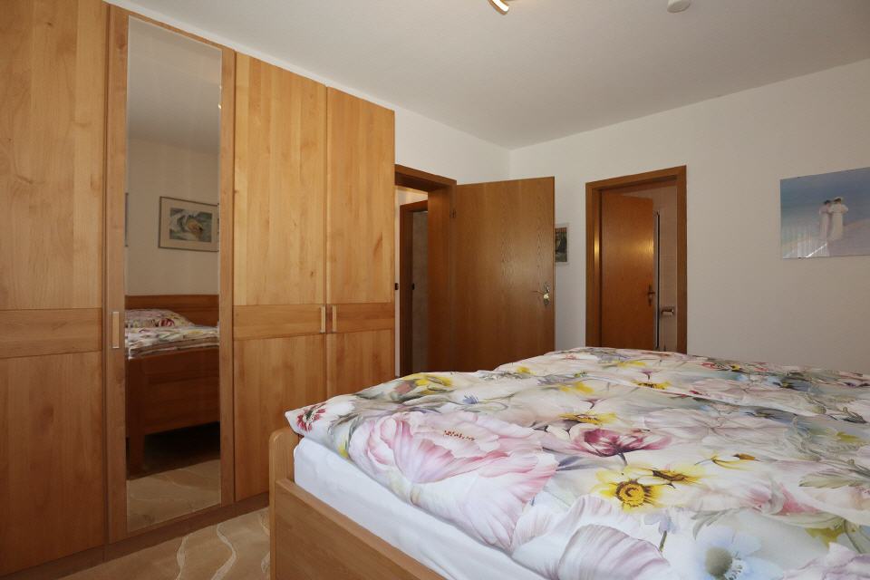 Das Schlafzimmer ist geschmackvoll eingerichtet mit einem Doppelbett mit ausgezeichneten Matratzen und Decken nach Wahl (Sommer, Winter, Daunen, Seidenbetten, Allergiker) sowie einem großen Holzschrank.