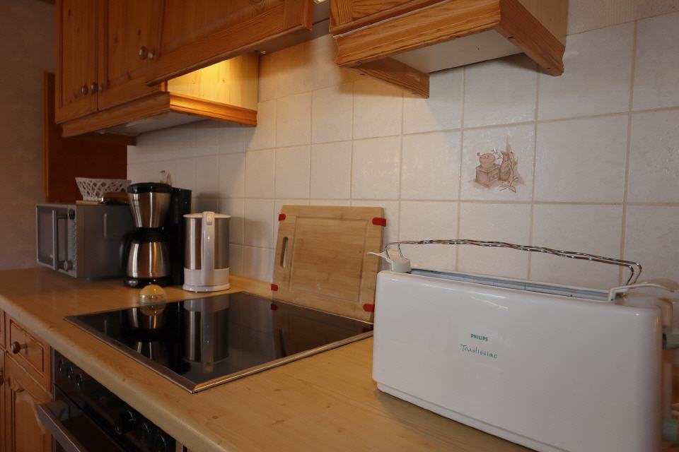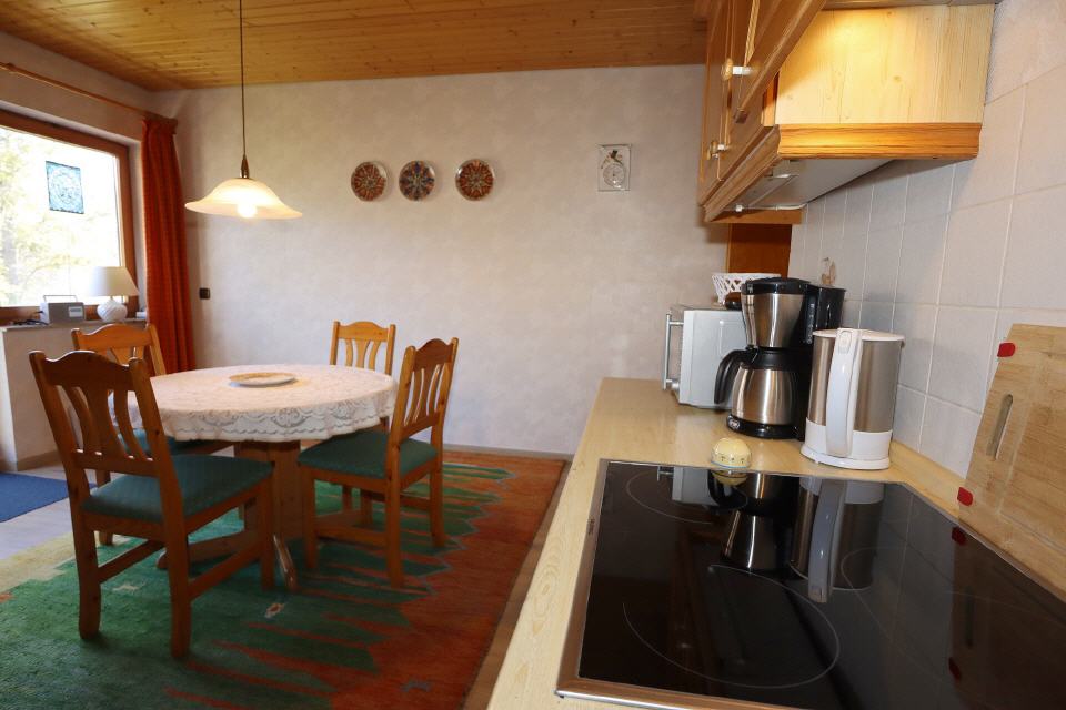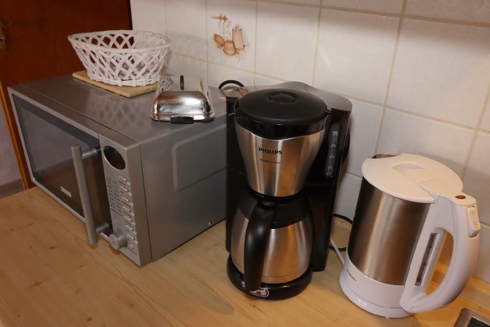 Das Esszimmer mit voll ausgestatteter Küche bietet vom Kühlschrank mit Eisfach, dem Geschirrspüler, Mikrowelle, Kaffeemaschine, Herd bis zur reichhaltigen Geschirrausstattung allesa, was eine moderne Küche auszeichnet.