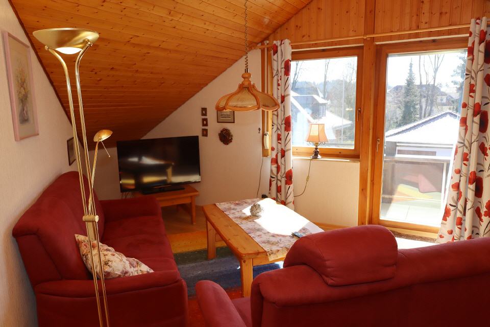 Im Wohnzimmer erfreut eine sehr schöne und rückengerechte Couchgarnitur (3-er, 2-er Couch und Sessel) den Gast. Ein großer neuer Fernseher (55 Zoll) passt sich gut in das Ganze ein. Auf der Südseite grenzt ein großer Balkon an, der zur Freilufterholung bestens geeignet ist.