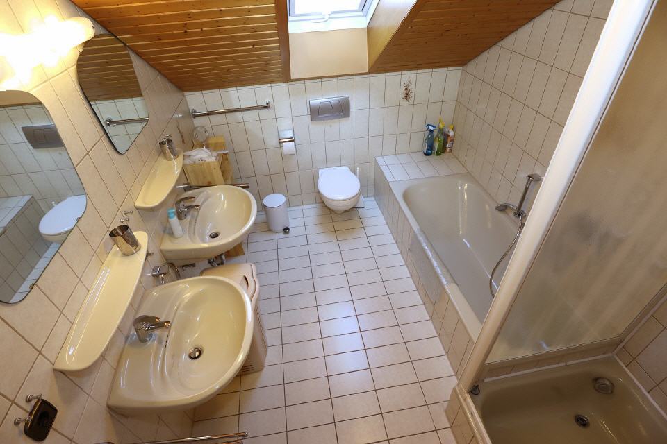 Das Bad ist frisch herausgeputzt. Mit einer eigenen Dusche, getrennter Badewanne und einer Waschmaschiene sowie einem WC erfüllt es alle Wünsche. Neben dem Badezimmer befindet sich ein weiteres WC.