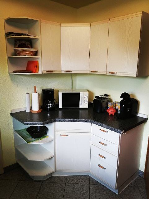 - Einbauküche mit Kaffeemaschine, Eierkocher, Tassimo, Spülmaschine, Mikrowelle, Toaster, Wasserkocher.