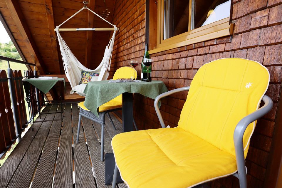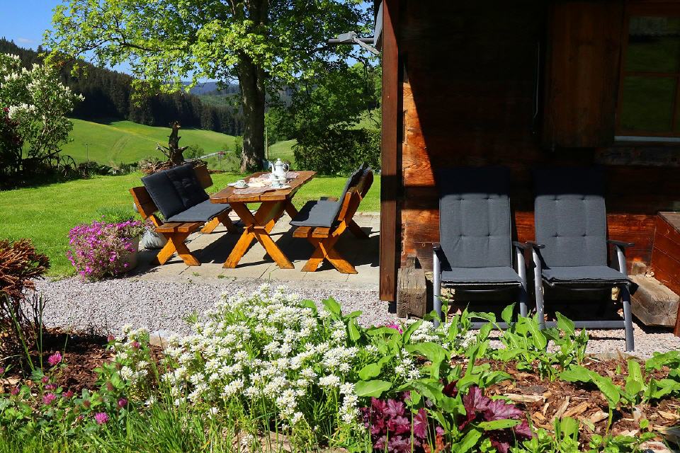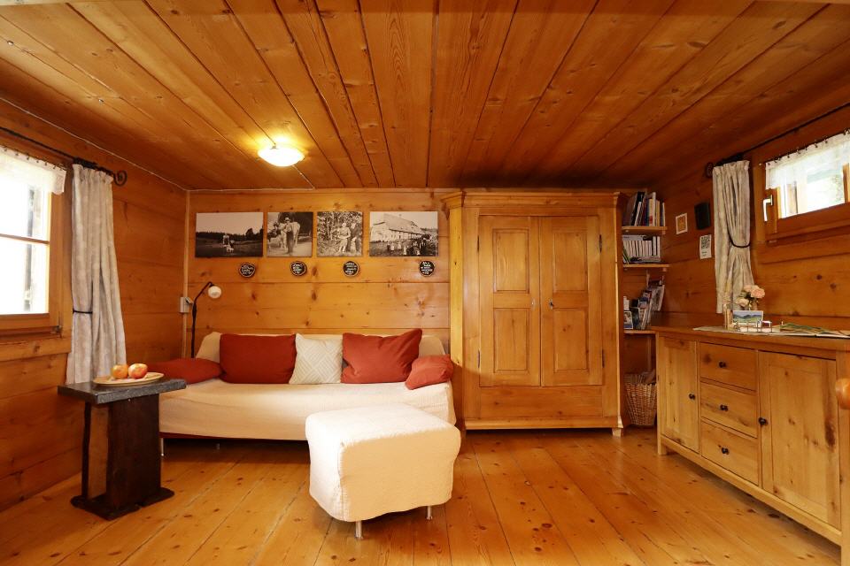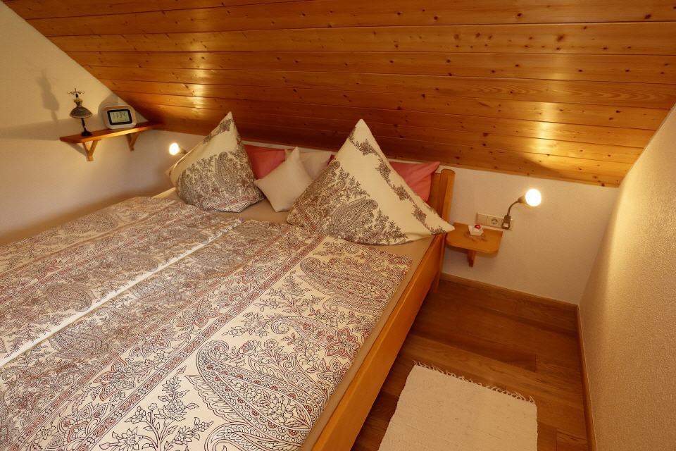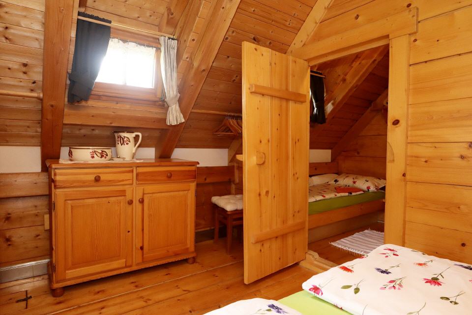 Das freistehende Ferienhäuschen bietet mit seinen 58 qm Wohnfläche Platz für 4 bis 6 Personen. Im unteren Stockwerk liegen die voll ausgestattete Küche sowie eine urige Wohn- und Essstube mit Sat-TV. Hier trifft sich die Familie zum gemeinsamen Essen und gemütlichen Beisammensein. Im oberen Stockwerk befinden sich neben dem Bad zwei separate Schlafräume. Ein Zimmer davon ist mit einem Doppelbett und das andere Zimmer mit zwei Einzelbetten möbliert. Vor dem Ferienhaus lädt eine große Liegewiese mit Freisitz und Grillmöglichkeit zum sonnenbaden, spielen und gemeinschaftlichen Essen ein.