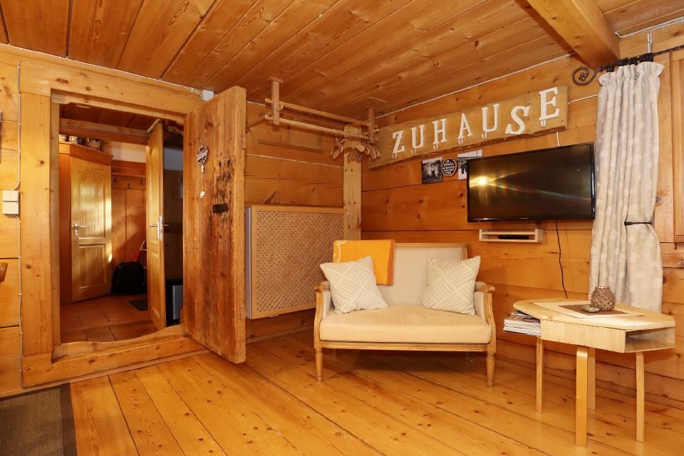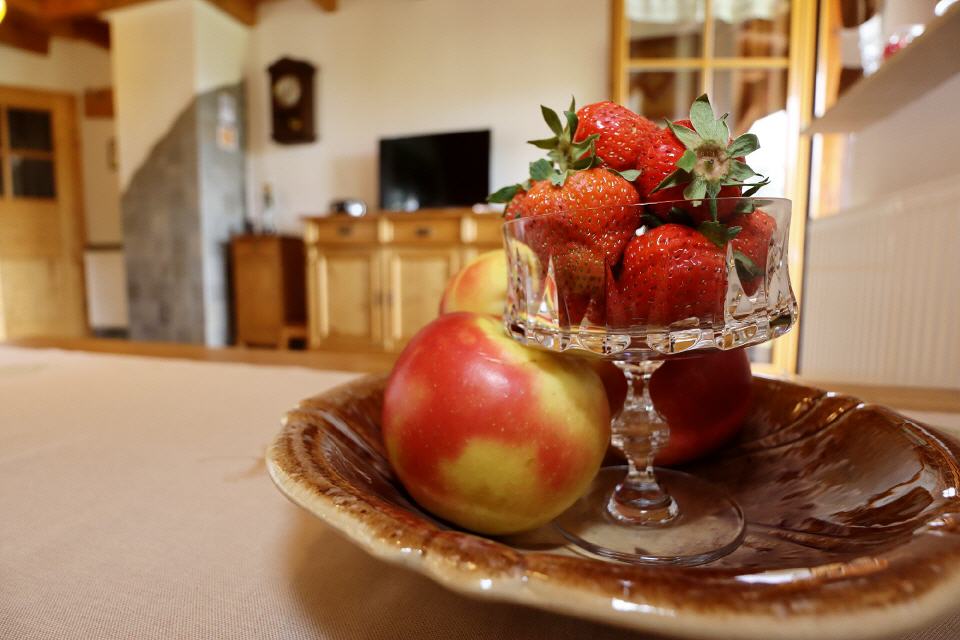 Die gemütliche Inneneinrichtung wurde größtenteils aus hofeigenem Holz von örtlichen Handwerkern angefertigt. So lädt zum Beispiel die schöne helle Küche mit ihrer großen Essecke zum gemütlichen Beisammensein ein. Der behagliche Wohnbereich ist unter anderem mit einer großen bequemen Couch und einem Flachbild Sat-TV ausgestattet. Die Ferienwohnung verfügt über zwei separate Schlafräume. Ein Zimmer davon ist mit einem Doppelbett und das andere Zimmer mit zwei Einzelbetten möbliert. Das moderne Bad verfügt neben einer großen Dusche, WC, Kosmetikspiegel und Fön auch über eine Fußbodenheizung.