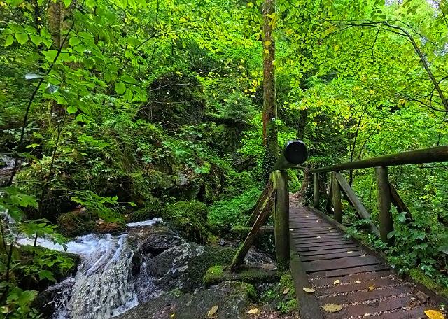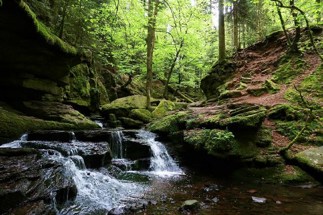 Die wilde Monbachschlucht bei Bad Liebenzell ist ein Erlebnis besonderer Art und sollte bei einem Urlaub im Nordschwarzwald nicht fehlen. Der Weg führt über schmale Pfade, umgestürzte Baumstämme, vorbei an sattgrünen Flussauen, glitzernden Bächen, wilden Felsformationen und einem echten Wasserfall. Bild antippen!