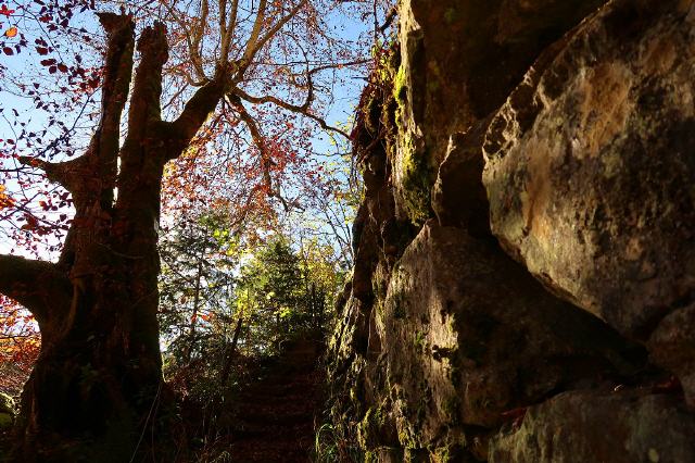 Das Räuberschlössle bei Göschweiler (Stadt Löffingen) ist ein kleines, rundes Felsplateau, das auf einem 80 m hohen Felsen direkt über einem der wildesten und eindrucksvollsten Abschnitte der Wutachschlucht steht. Dort auf dem Nägelefelsen soll die Burg Neu-Blumberg gestanden sein. Zu sehen sind kaum Mauerreste, aber ein eindrucksvoller Felsen mit Aussichtsplattform. Bild antippen!