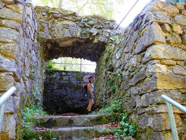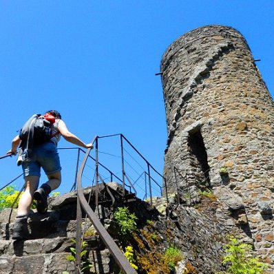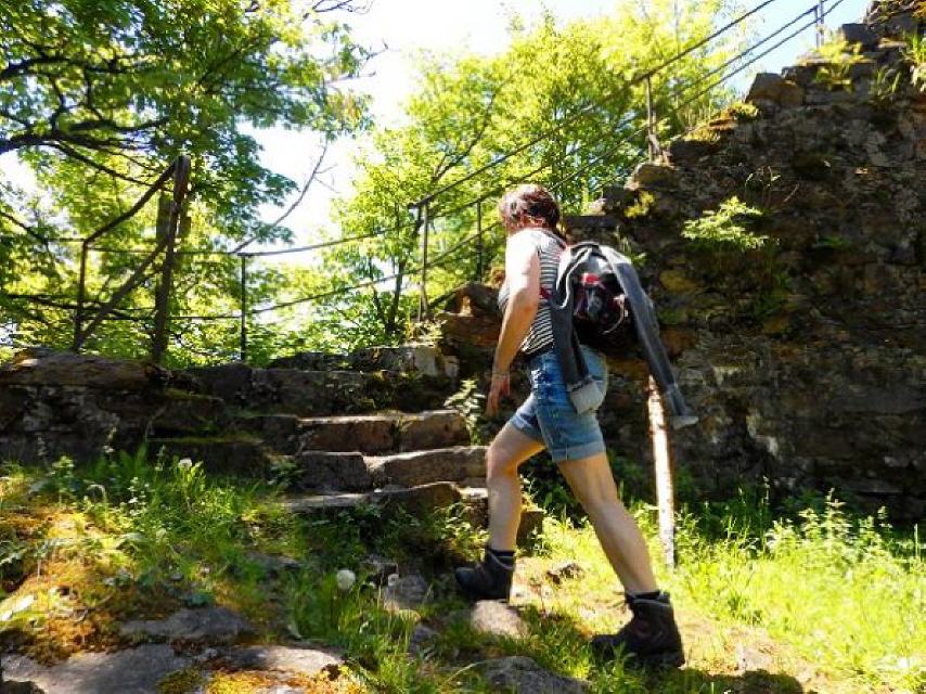 Von der Brücke geht es nun nur noch leicht ansteigend etwa 800 m zur Ruine Bärenfels. Von der ehemaligen Burganlage sind der 16 Meter hohe Bergfried mit seinem Hocheingang in 9 Meter Höhe und einem 6,4 Meter großen Durchmesser sowie Reste einer 3,6 Meter starken Schildmauer erhalten. Legen Sie im schattingen Innenhof ruhig eine Pause ein. Genießen Sie vom zugänglichen Turm das Panorama. Sie erkennen den Wehratalstausee, die Stadt Wehr, aber auch Rheinfelden, den Hochrhein und dahinter die Schweiz, das Wiesental mit Schopfheim, Lörrach und die Burgruine Rötteln.