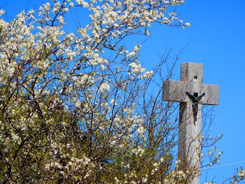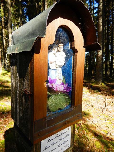 Weiter geht`s in den Wald; bald wird im Wald die Höhe erreicht; von dort aus links halten. Zwei Gedenkkreuze erinnern an ein dunkles Kapitel der Geschichte. Auf Geheiß der Nazis wurden hier im Juli 1944 fünf amerikanische Flieger nach einem Fallschirmabsprung erschossen.