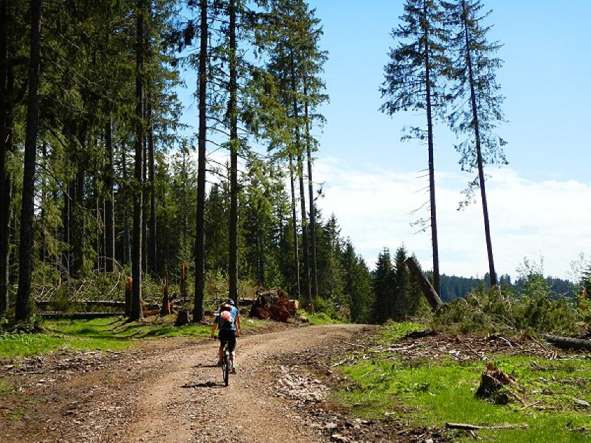 Der Waldweg auf dem Schollacher Sommerberg geht nach Westen in Richtung Rengethof und Oberengenbachhof. Der Waldrand liegt unterhalb des Weges; manchmal geben die Bäume einen Blick auf den Renget mit Teichen und einzelnen Bäumen frei.