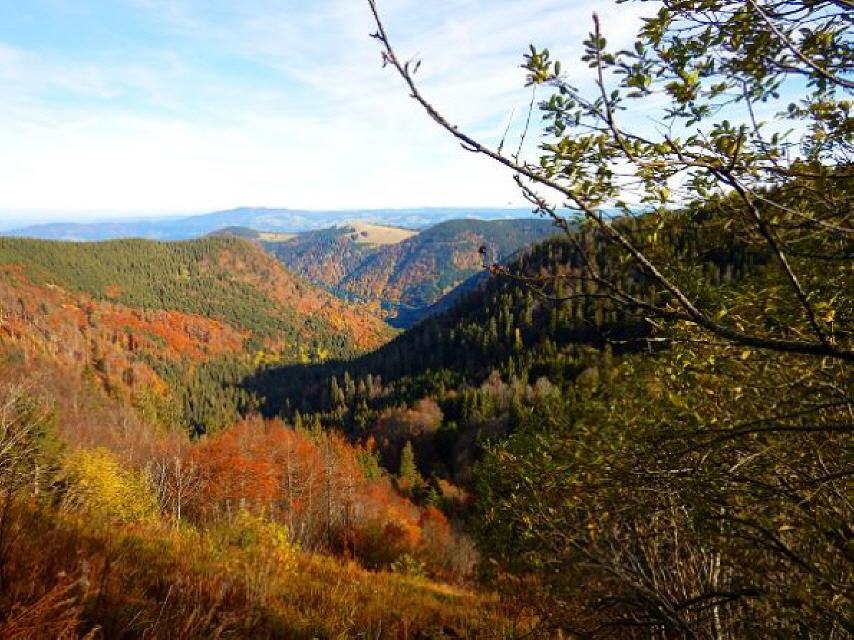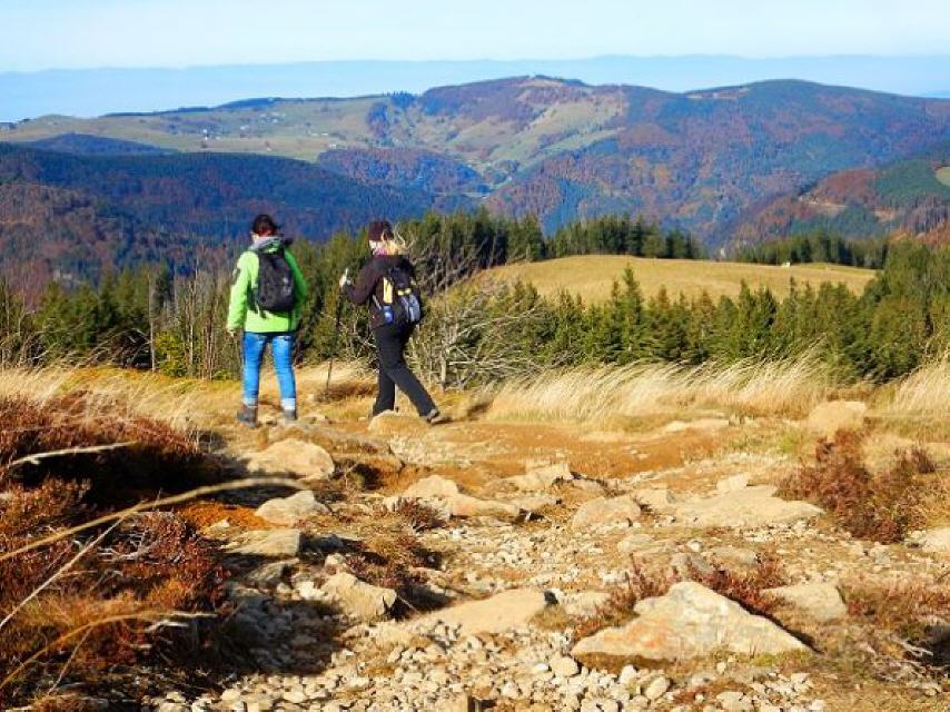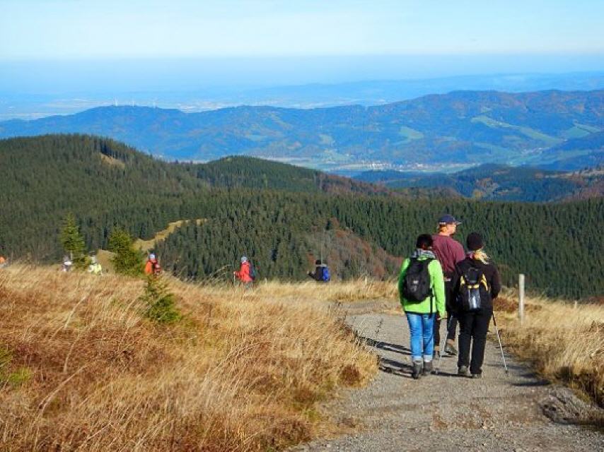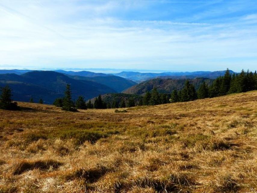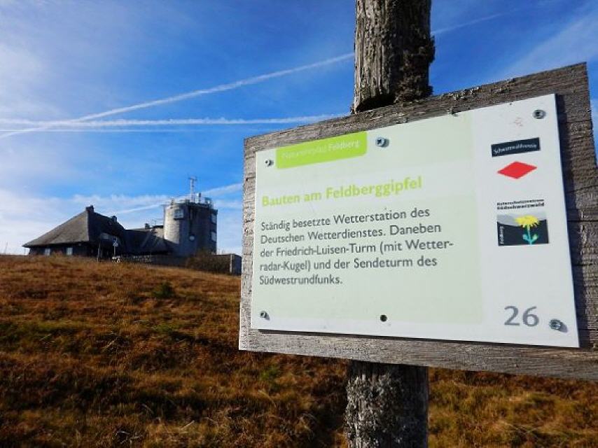 Vom offiziellen Startpunkt, dem “Haus der Natur”, geht es bergauf in Richtung Panoramaweg. Sobald wir die ersten Höhenmeter überwunden haben, werden wir bei guter Witterung mit einer atemberaubenden Fernsicht auf die Vogesen im Westen und die Schweizer Alpen im Süden für die Aufstiegsmühe belohnt. Den Besuch des Bismarckdenkmals und der Bergbahn können wir uns ersparen, zumal sich hier sowohl in den Sommermonaten als auch in der übrigen Jahreszeit die meisten Feldbergtouristen aufhalten.