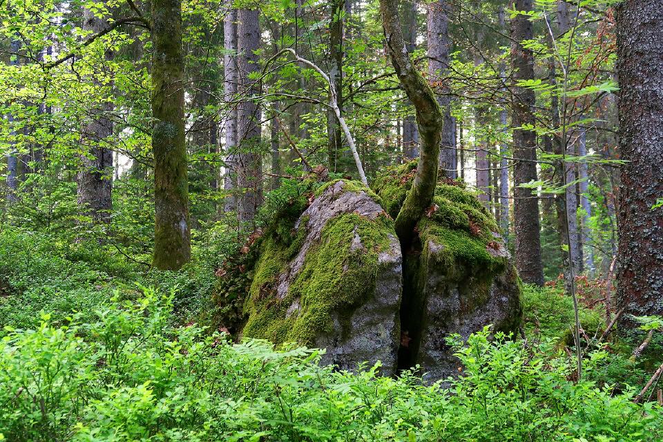 Von nun an geht es bergab. Über die Wiese, wo auch das kleine Säbelthomahaus steht, und den dichten Wald wanderst Du bis zum Vicenz-Zahn-Felsen und steigst dann auf einem Teil des Erlebnispfades hinunter zum Kurgarten und zurück zum Ausgangspunkt am Kurhaus.