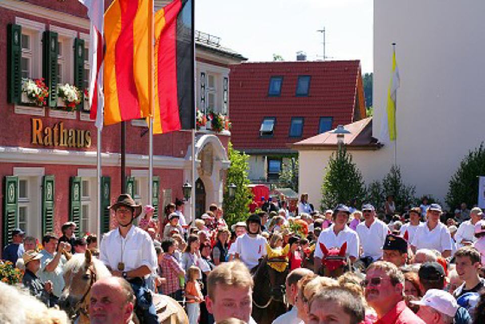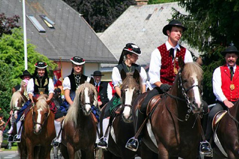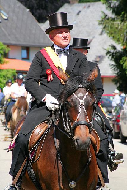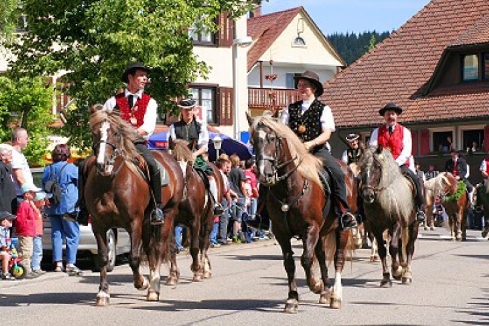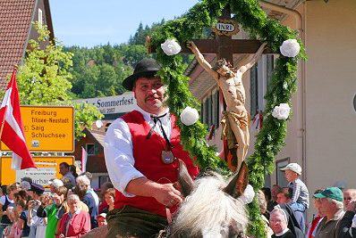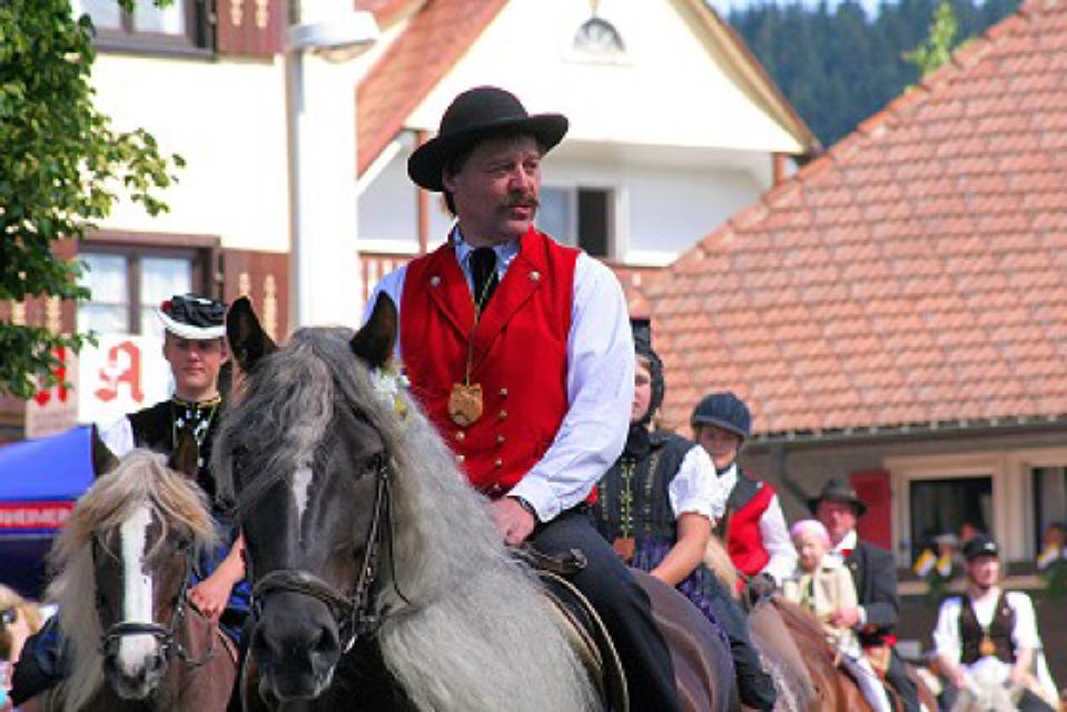 Von nah und fern kommen am Festtagsmorgen Rosse und Reiter, versammeln sich und ziehen – voraus die Chorknaben in roten Gewändern und mit wehenden Fahnen – zum Feldaltar, der bei dem im Friedhof stehenden Eligiuskirchlein auf einem Wiesenplan aufgeschlagen ist. Eine Musikkapelle in schmucken roten Bauernwesten begleitet den Gesang der Gläubigen. Wie blankes Gold funkeln die Instrumente in der Sonne. Fromme Lieder steigen aus hunderten von Kehlen zum Himmel empor. Es singen die Bäuerinnen, die, angetan mit der ernsten Bänderhaube, vom Gebiet um den Titisee herüberkamen, oder jene mit den gestickten blauen und grünen Miedern und dem schmucken Strohhut aus der Breitnauer Gegend.