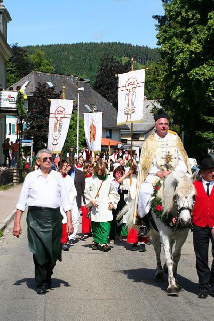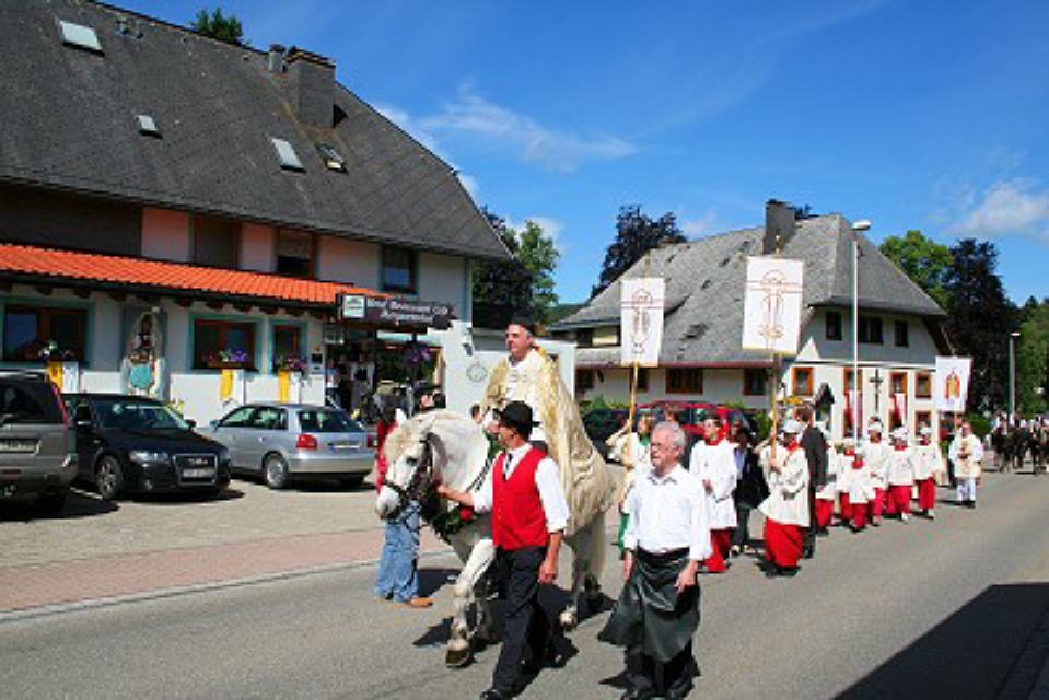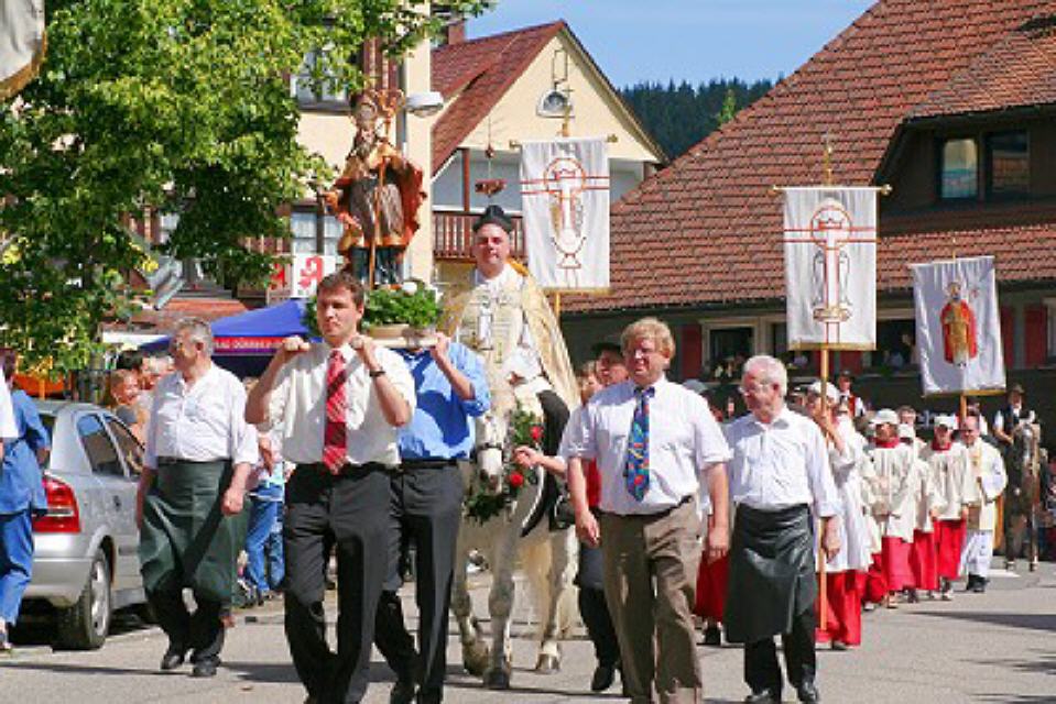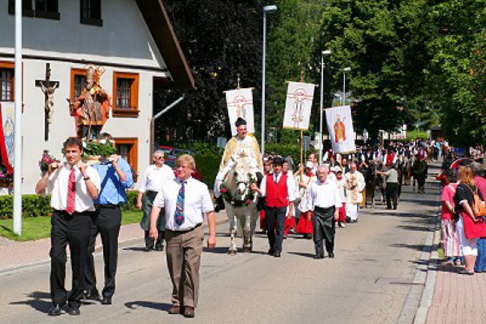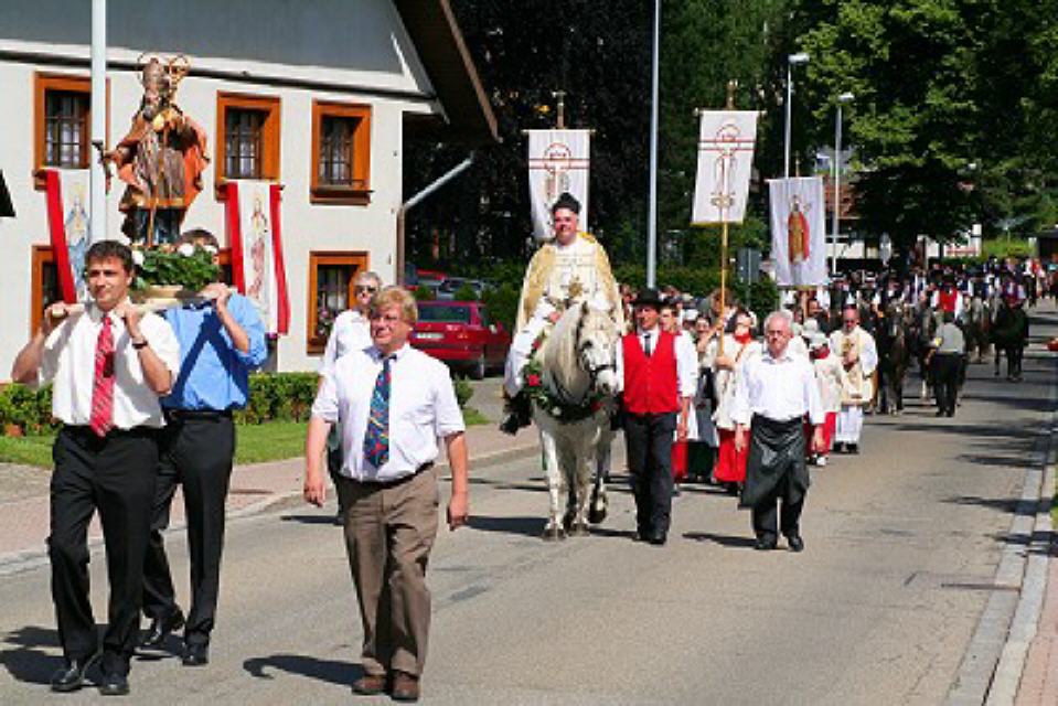 Hoch zu Ross erleben die Bauern in ihrer Schwarzwälder Tracht den Gottesdienst. Gesenkten Hauptes, als wären sie sich der feierlichen Handlung bewusst, stehen die mit Blumenkränzen und frischem Tannenreis geschmückten Pferde da. Mit goldfunkelndem Kreuze segnet der Priester im festlichen Ornat das vor ihm ausgebreitete Eulogiusbrot. Er segnet auch die niedergeknieten Gläubigen und sprengt das geweihte Wasser über die Pferde. Langsam schreitet der Zug an geschmückten Häusern vorbei zum Ort zurück, wo vor der Kirche in feierlichem Tedeum, umbraust vom Glockengeläut, die kirchliche Feier ausklingt.