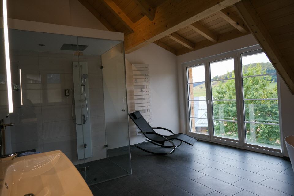 - Das Luxusbad mit frei stehender Badewanne, Dampf Aroma Duschsauna für zwei Personen, Ruheliegen und Panoramablick runden den luxuriösen Komfort ab, den unser Chalet zu bieten hat.