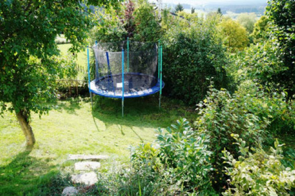 Mehrere Sitzgelegenheiten rund ums Haus sowie ein großes Trampolin (Sommer).