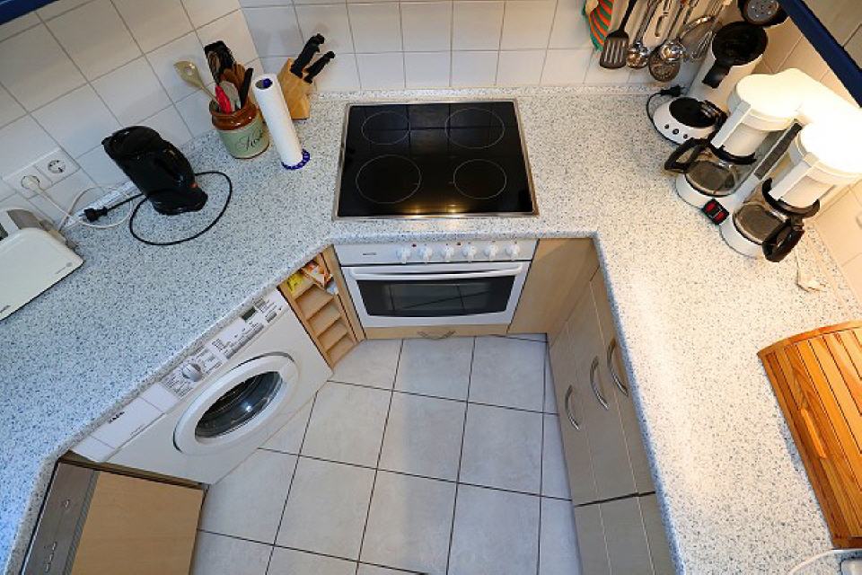 Küche komplett ausgestattet mit Kaffeemaschine, Toaster, Wasserkocher, reichlich Geschirr