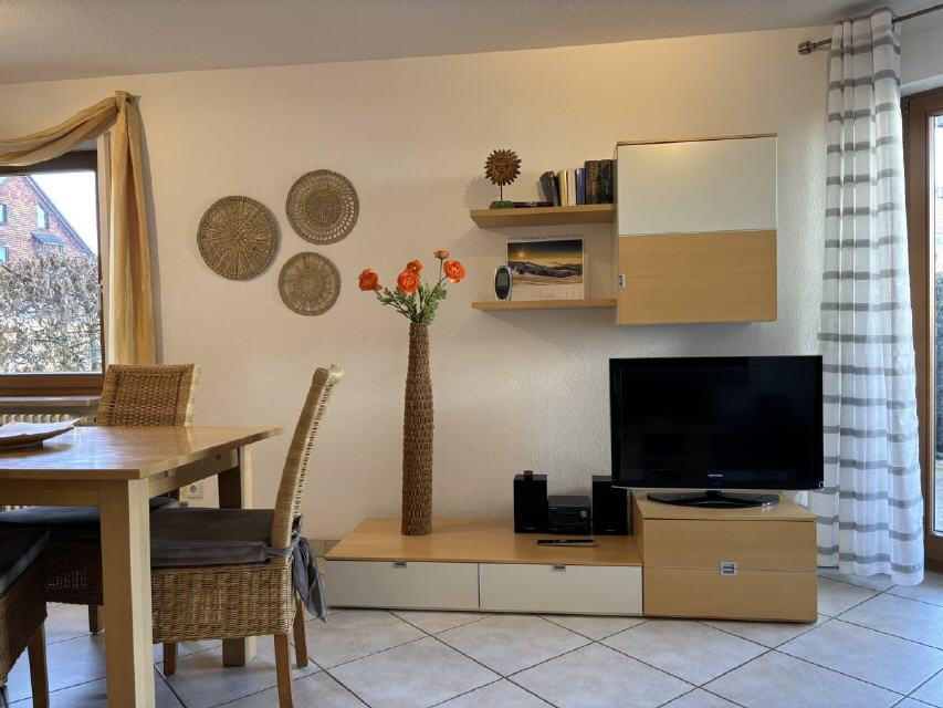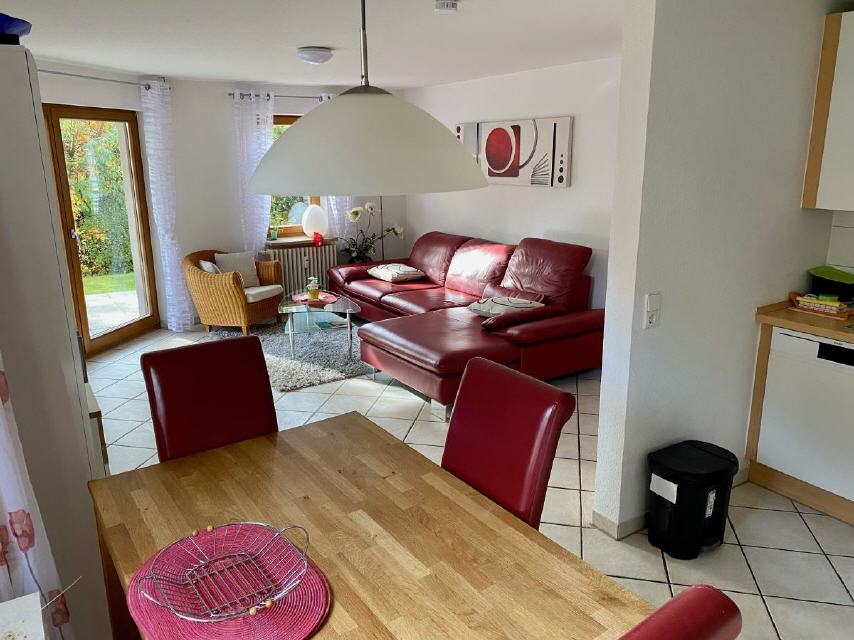 Genießen Sie Ihren Aufenthalt in unserer Ferienwohnung und erleben Sie erholsame Tage. 48 qm, geeignet für 2 Personen, Erdgeschoss, 2 Zimmer, 1 Schlafzimmer, 1 Badezimmer. Die modern und hell eingerichtete Wohnung liegt im Erdgeschoss des Hauses. Im Wohnzimmer steht eine bequeme Sitzecke mit Sesseln und einer Couch, auf der eine weitere Person übernachten kann. Vom Wohnraum gelangen Sie auf die mit Gartenmöbeln ausgestattete Terrasse. Das Badezimmer hat eine Dusche. Im separaten Schlafzimmer befinden sich ein Doppelbett mit Nachttischen und einem Kleiderschrank. Ein Tiefgaragenstellplatz steht Ihnen während Ihres Aufenthaltes zur Verfügung.