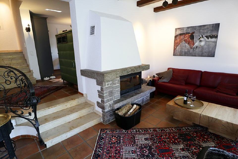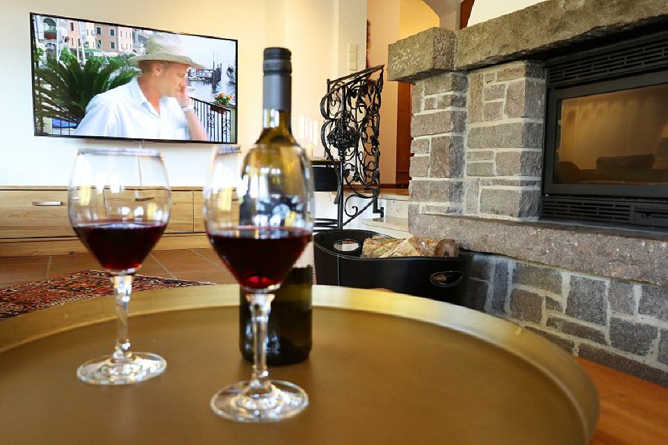 Wohnzimmer: gemütliche Wohnlandschaft, großer TV-Flachbildschirm, Stereoanlage, Kaminfeuer