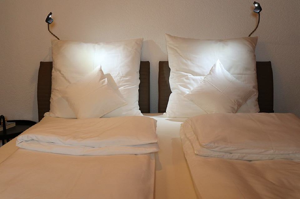 Schlafzimmer EG: Boxspringbett 2 x 2 m (teilbar), Nachttische, Nachttischleuchten, Kleiderschrank