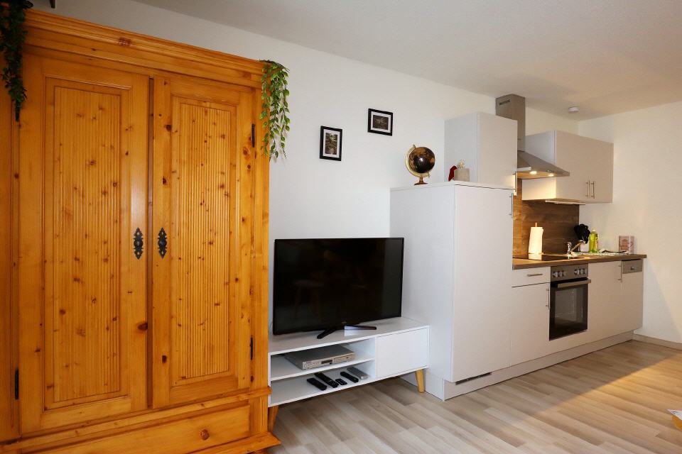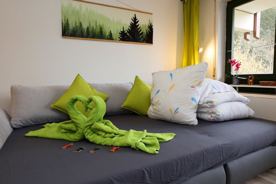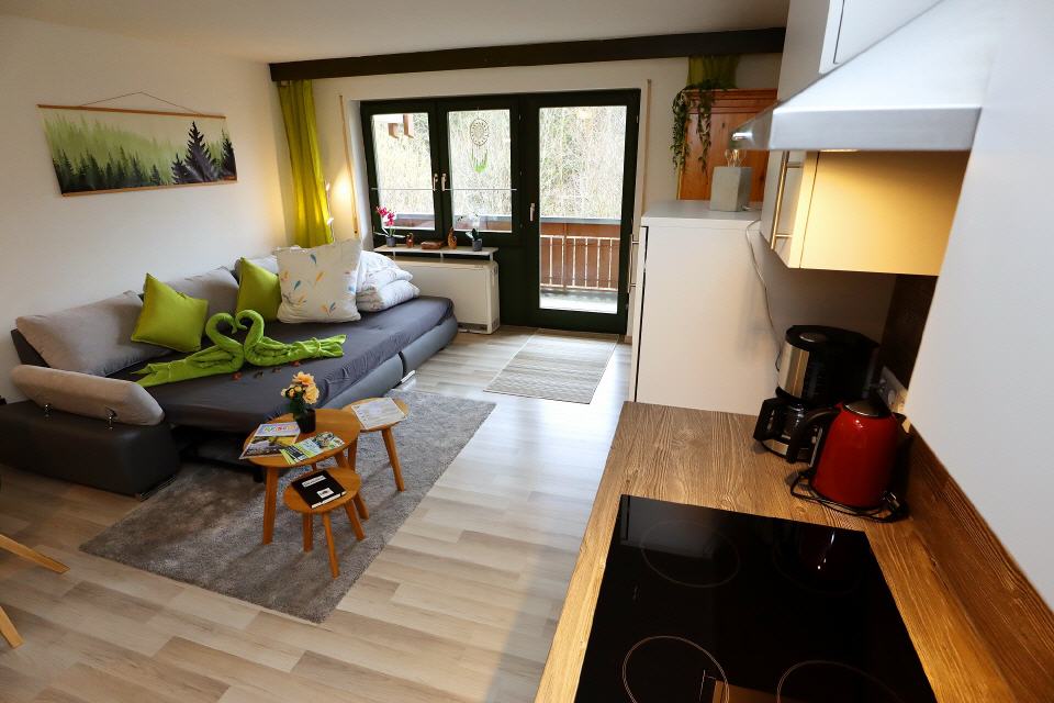 Das stilvoll eingerichtete Apartment Ameisenpfad in Todtmoos im Südschwarzwald bietet auf 37 qm eine harmonische Kombination aus Komfort und Gemütlichkeit. Der offene Wohn- und Schlafbereich ist lichtdurchflutet und schafft mit seiner geschmackvollen Einrichtung eine warme, einladende Atmosphäre. Große Fenster eröffnen einen traumhaften Blick auf die umliegenden Wälder und Hügel. Eine voll ausgestattete Küche bietet alles, was man braucht, um sich auch im Urlaub selbst zu versorgen.