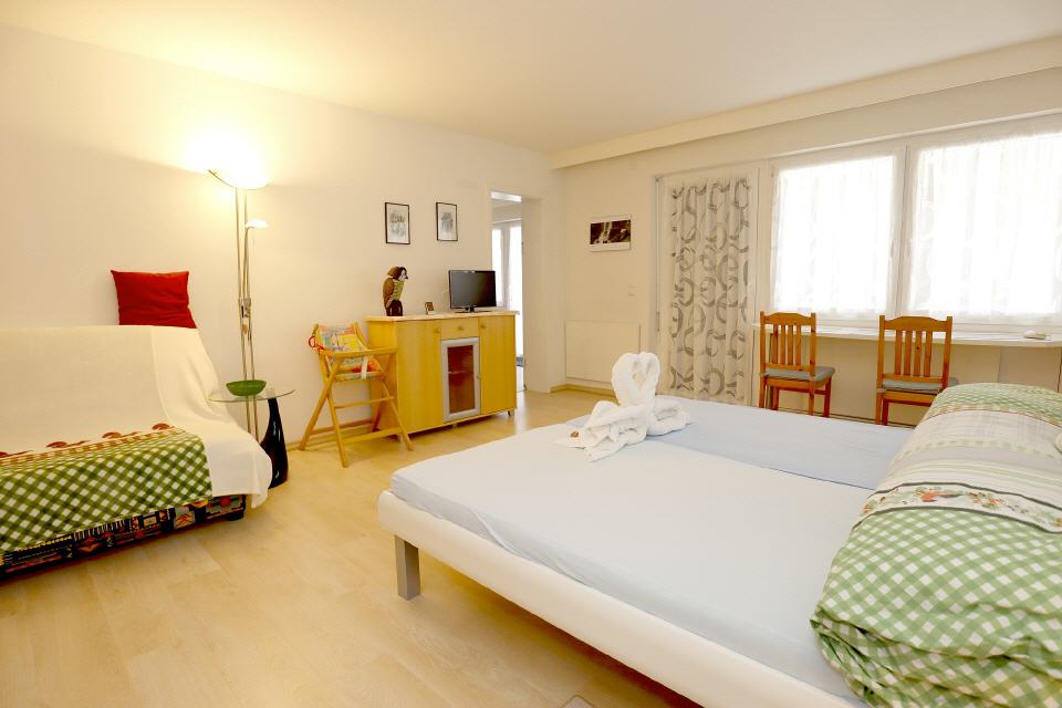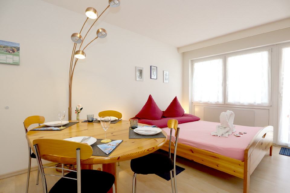 - Wohnbereich: Schlafsofa, Esstisch, TV Digital